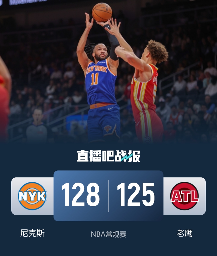 比赛开场,两队均很快进入比赛状态,双方陷入拉锯战,交替领先,节末布伦森连得5分帮助尼克斯33-27结束第一节。次节回来,双方内线主将开始发力,唐斯连续造成杀伤,奥孔武则是内突外投,各自单节砍下10分,但老鹰这边其他人手感不佳,尼克斯奇兵麦卡勒连中两记三分帮助尼克斯建立两位数领先,半场结束68-55老鹰。易边再战,老鹰进攻端状态回调,约翰逊连续取分,不过布伦森和唐斯同样延续状态给予回应,分差在10分上下浮动,三节结束尼克斯98-89保持领先。末节回来,老鹰全队发力开始蚕食分差,沃克单节得分上双,约翰逊和奥孔武也是予取予求,老鹰在最后一分钟依靠沃克的抢断反击取得反超,阿努诺比抢到前场篮板通过罚球再反超回来,随后又完成抢断,老鹰三分不中,比赛结束,尼克斯128-125险胜老鹰。